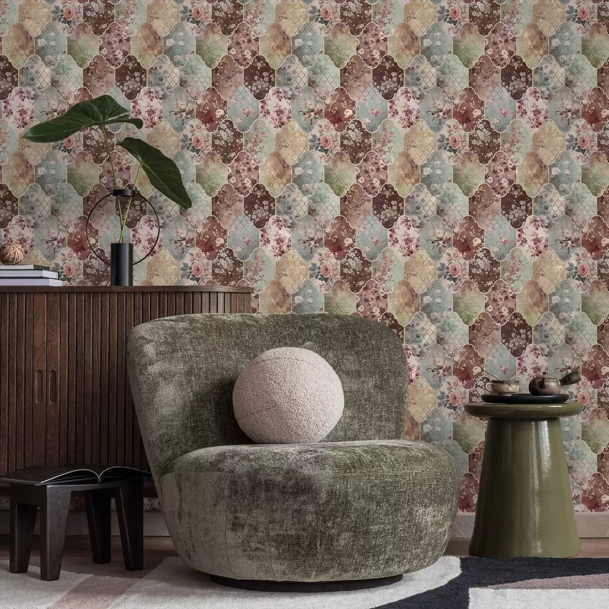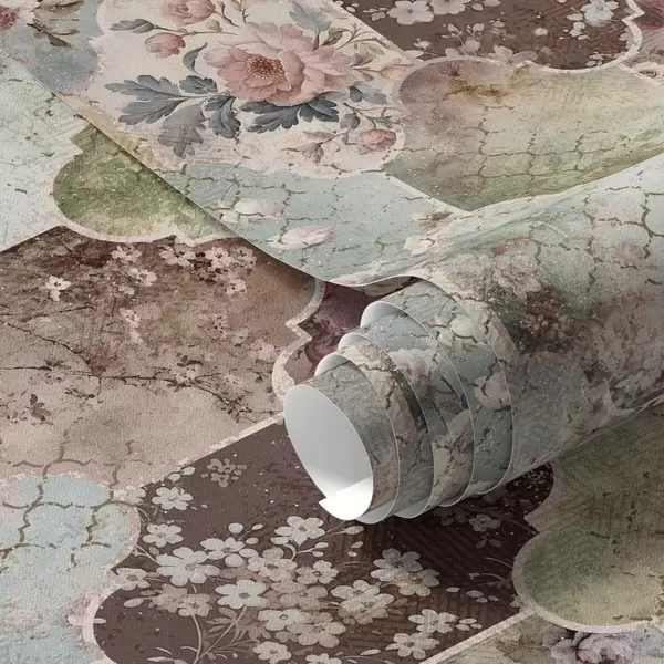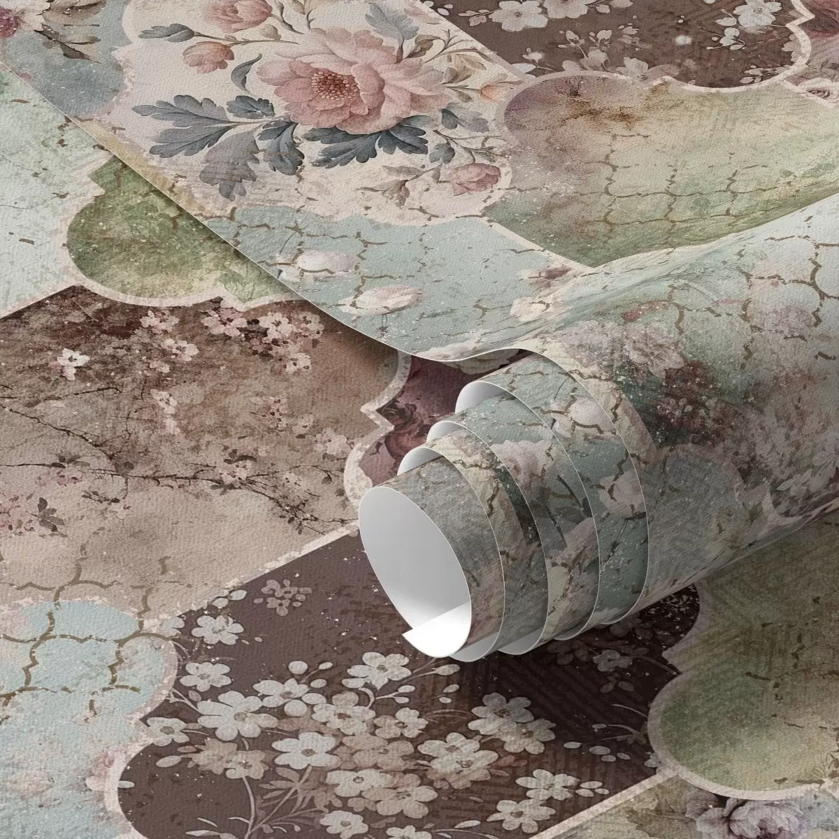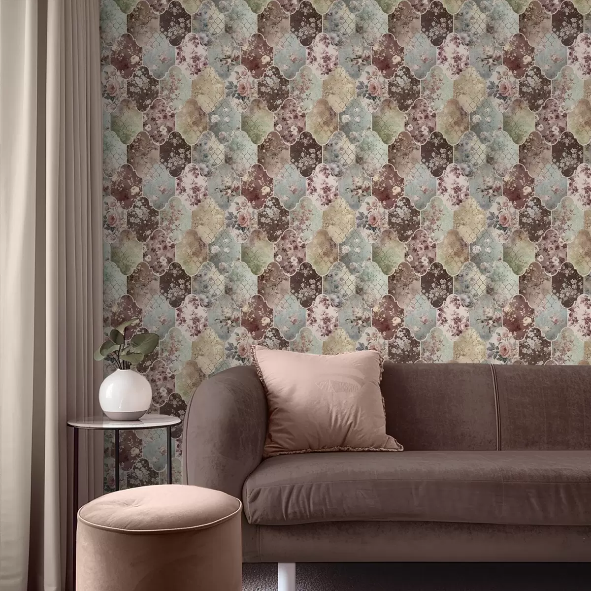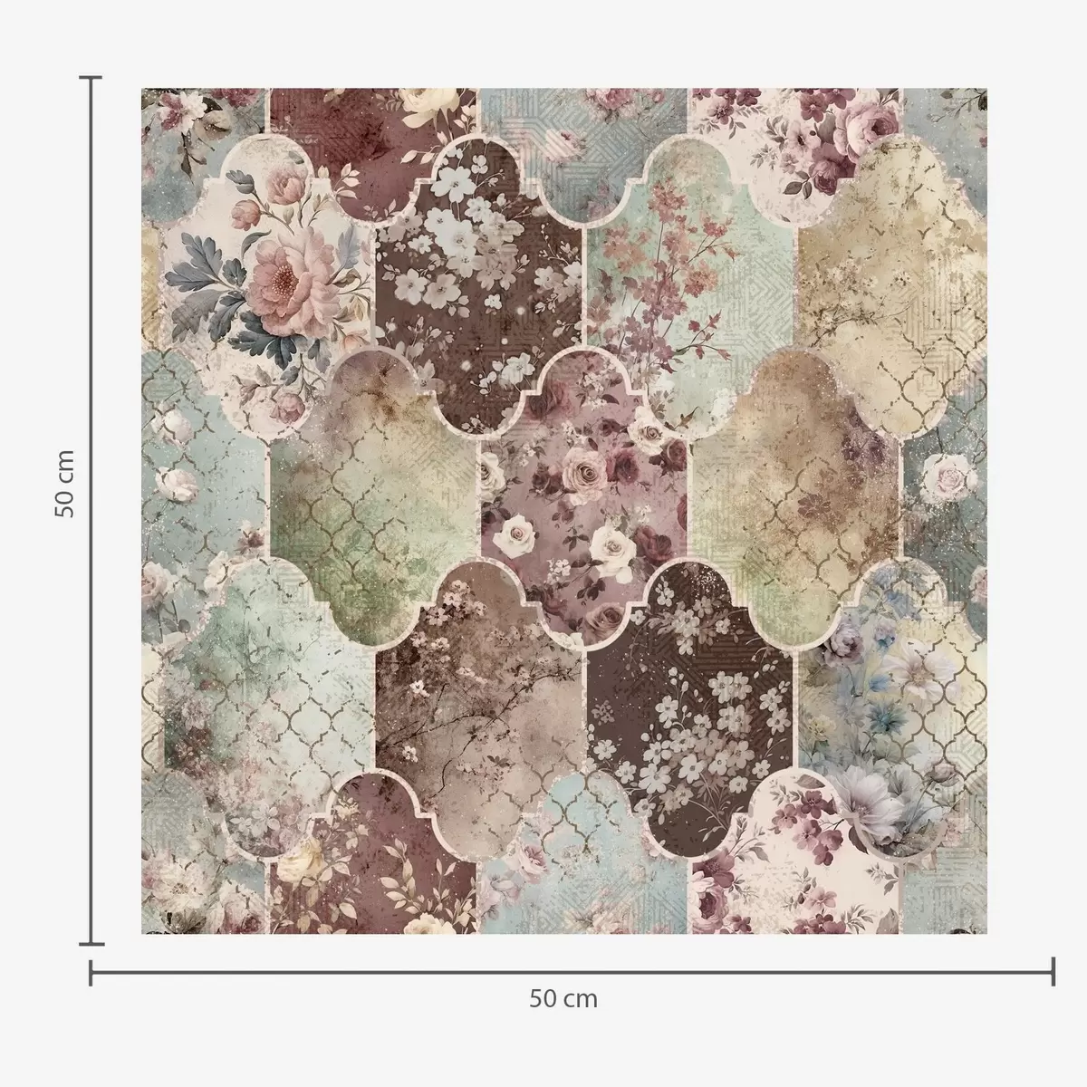 Papel tapiz Mosaico de paneles florales y azulejos desgastados con motivos decorativos. Nr. a01038