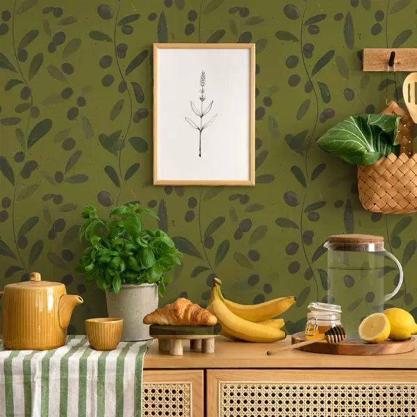 Papel tapiz Ramas verdes con hojas y bayas en olivo Nr. a01113