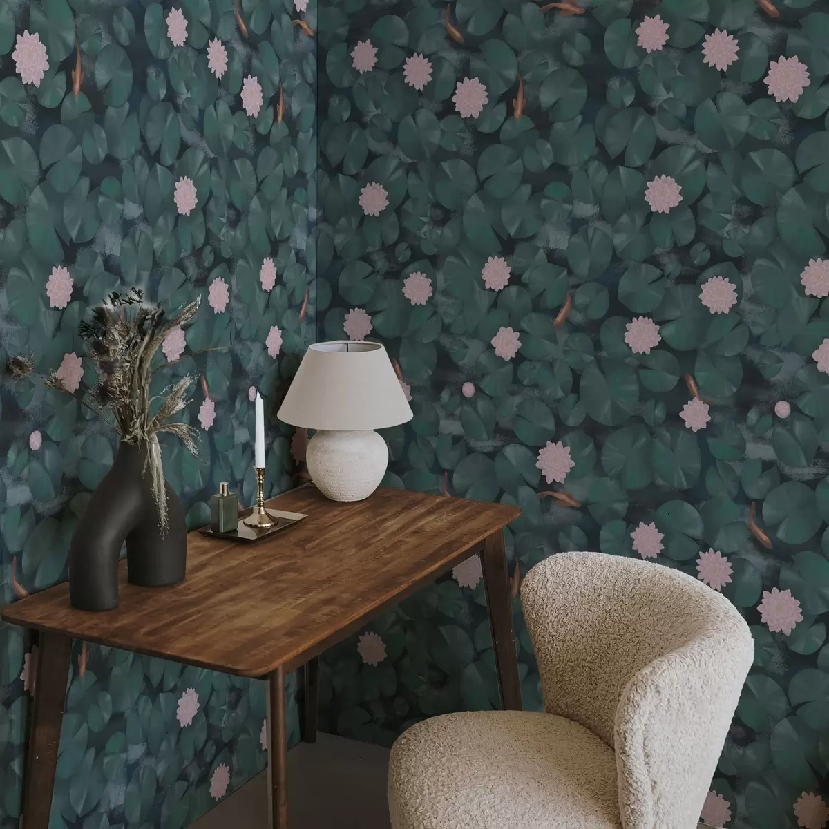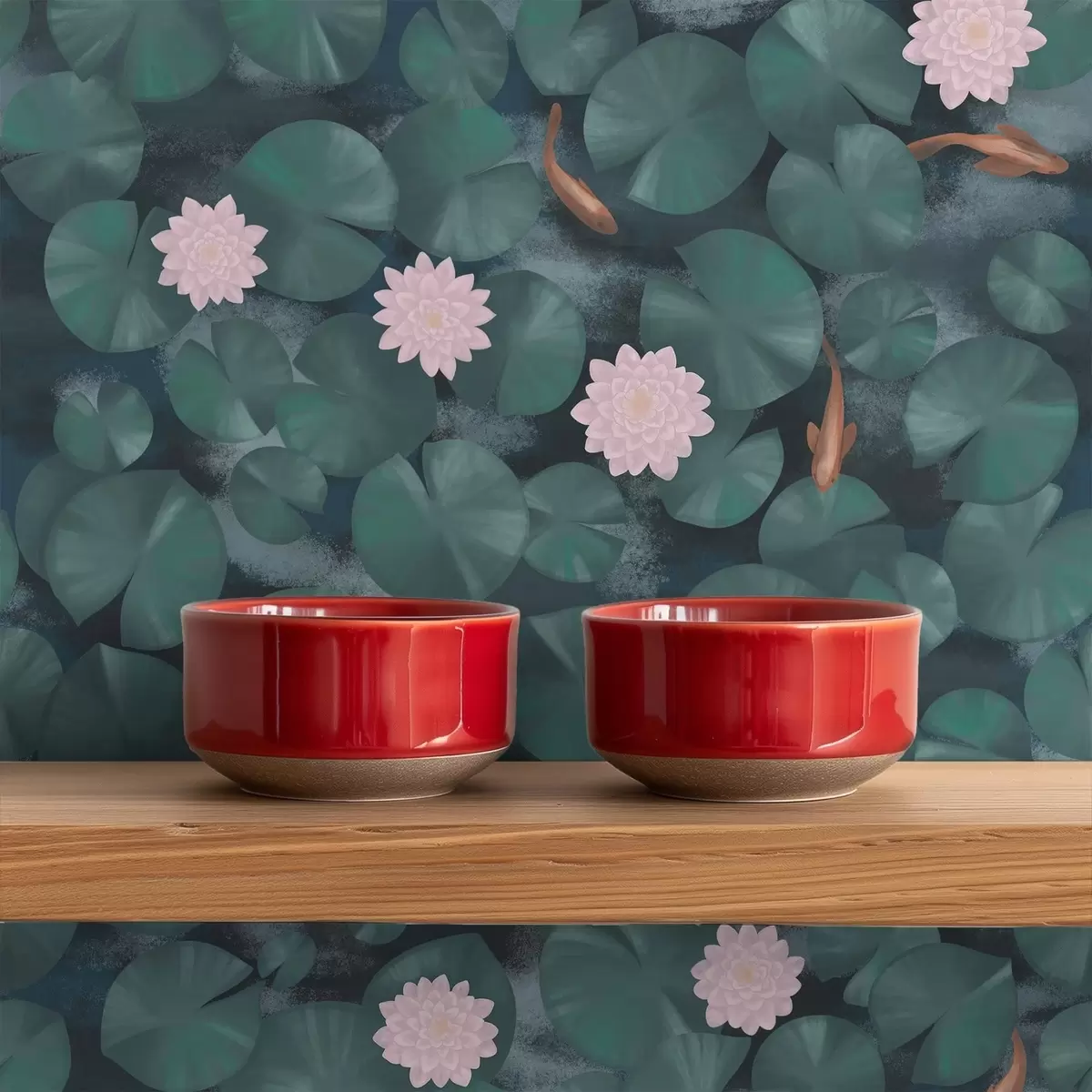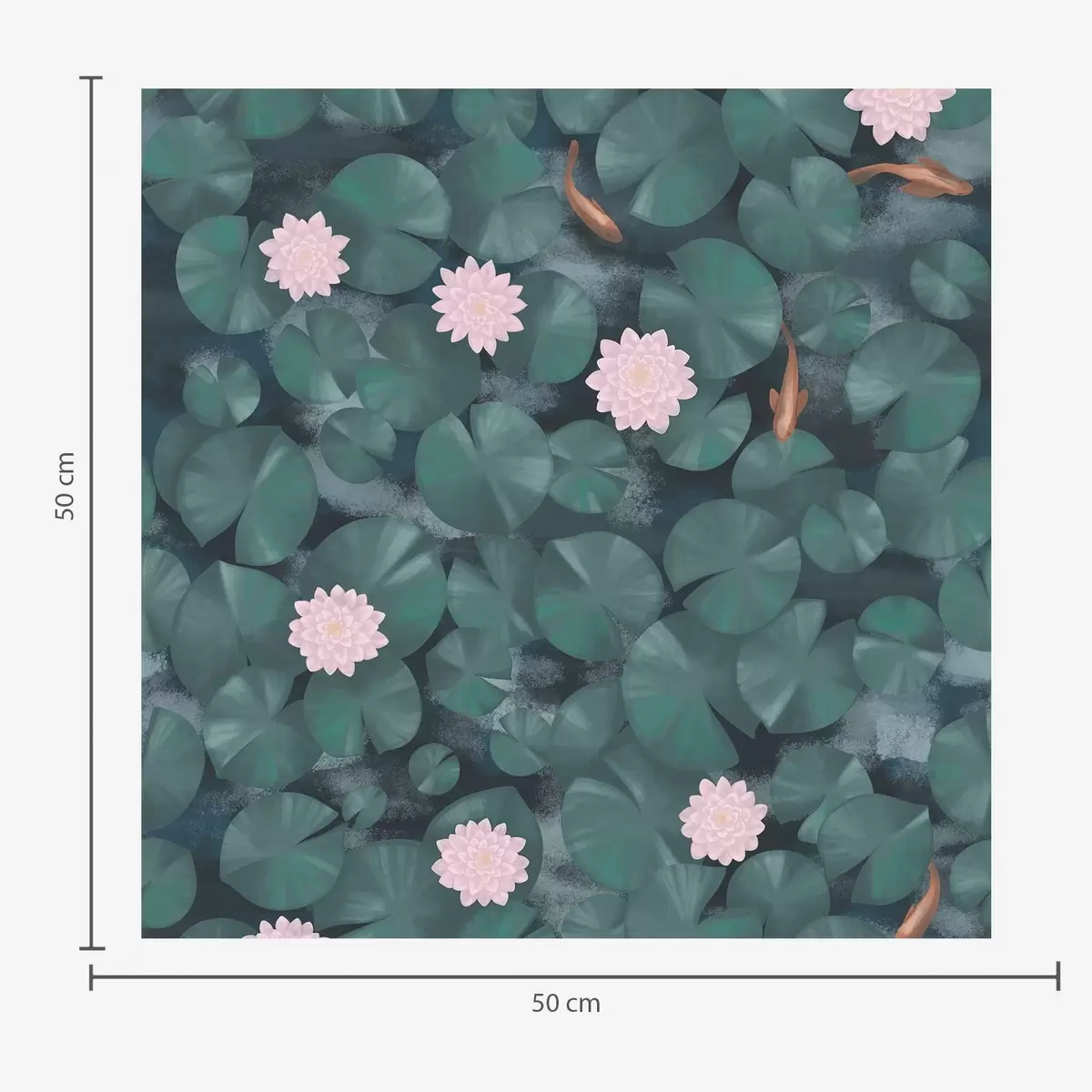 Papel tapiz Nenúfares con flores y peces sobre fondo oscuro Nr. a01177