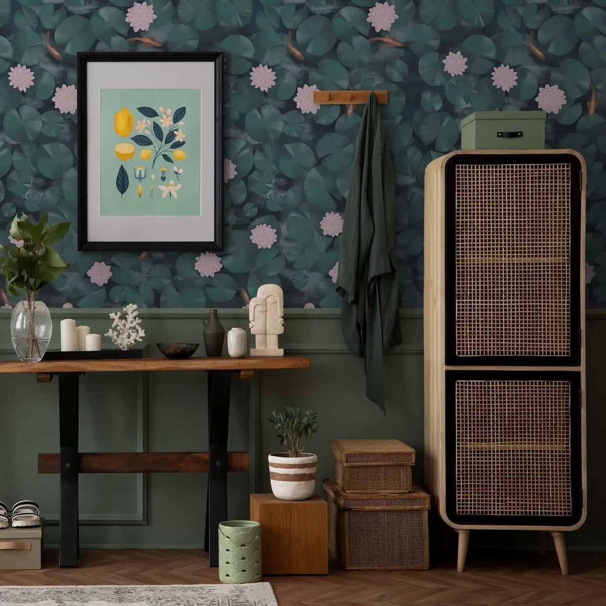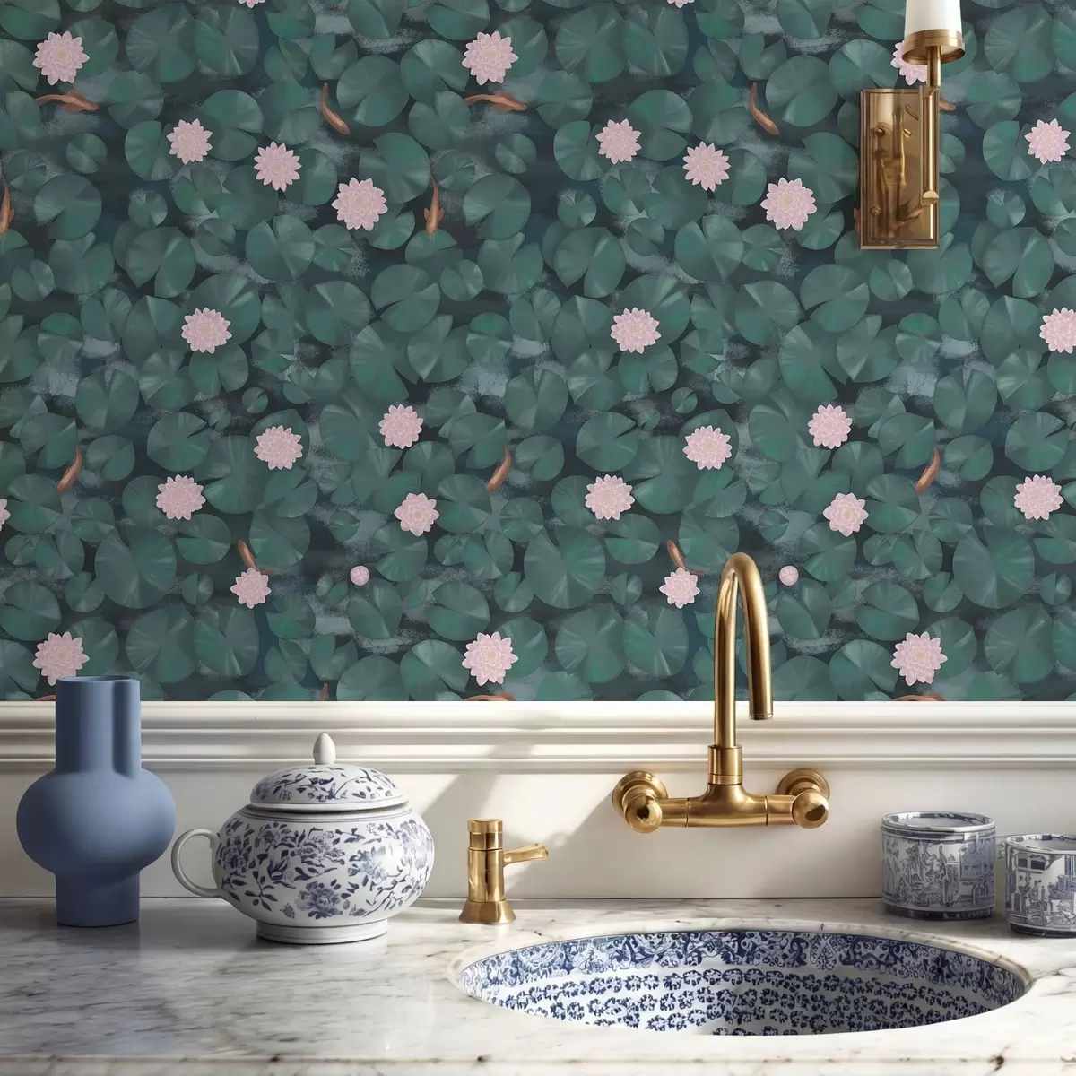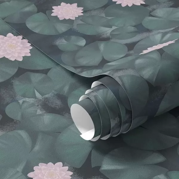 Papel tapiz Nenúfares con flores y peces sobre fondo oscuro Nr. a01177