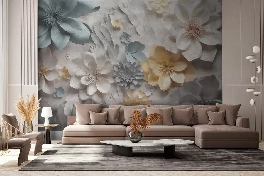 Flores volumétricas sobre fondo gris claro